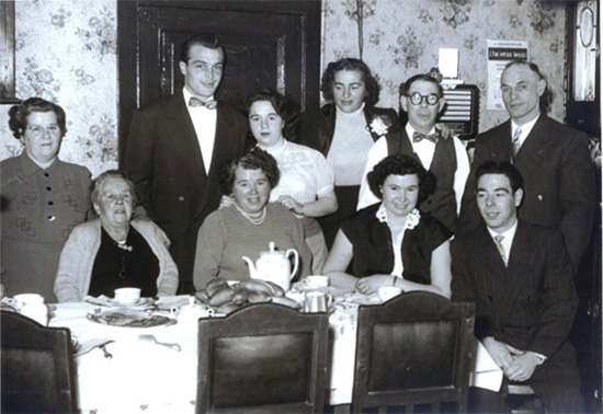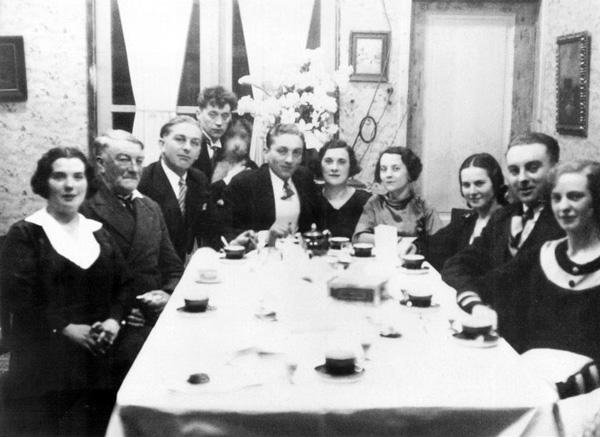 Groepsfoto genomen bij het huwelijk van Jeanne Van Oosterwijck en Pol Goegebeur anno 1952. De foto werd genomen bij de bruid thuis in de Lange Zavelstraat in Antwerpen.