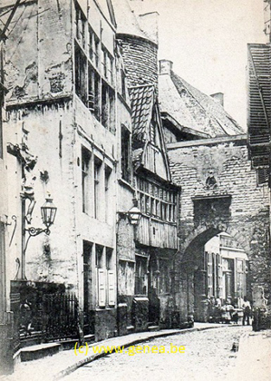 Antwerpen de verdwenen Steenstraat omstreeks 1880. Voorbij de arcade (inkom Steen) was de Gevangenisstraat, nu de helling tussen het Steen en het Steenplein.